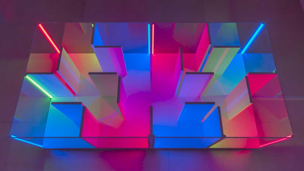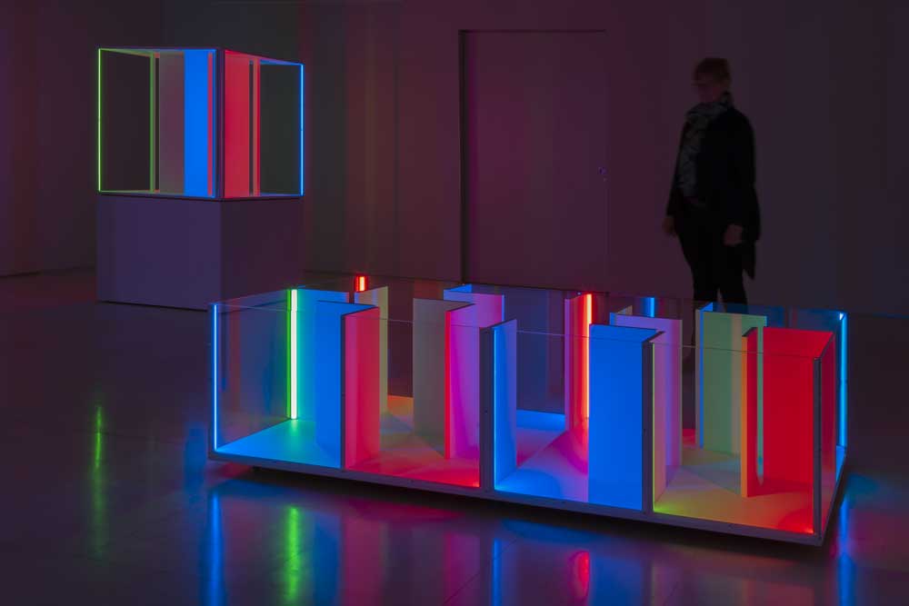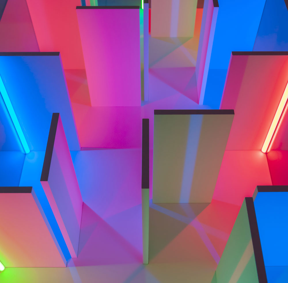 Los modelos desdibujan los límites de la escultura que se expande ocupando su entrono y produciendo una especie de ambiente lumínico. En el modelo 2 distintas barras de LED azul, rojo y verde se colocan en distintos puntos del laberinto de paneles blancos. Las luces se encuentran en los caminos, mezclándose entre ellas y creando colores complementarios que se expanden iluminado al espectador. El juego del espectador con la obra, su posición y transición provocan una incidencia en la luz que cambia constantemente.