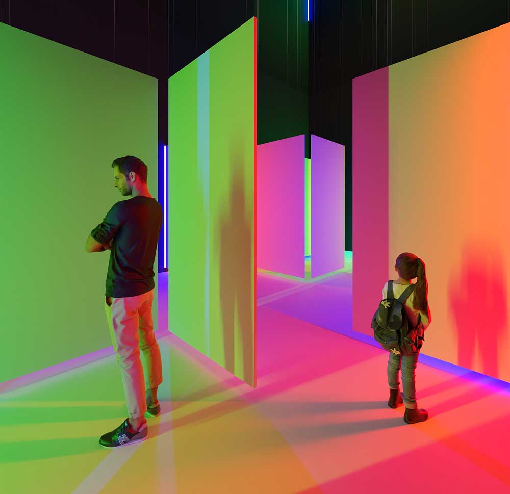 El proyecto que se basa en este modelo propone una sala rectangular con las paredes negras, el suelo blanco y el techo con espejo. El espacio interior se divide con tablas blancas suspendidas, como si fuera un laberinto. Por el perímetro de la sala se distribuyen doce barras de luz de los tres colores primarios de la luz. El espectador se ve inmerso en un espacio lumínico, sumergido en un mar de color cuando ve su reflejo en el techo y explorando el espectáculo de colores mientras transita, con pausa, el espacio.