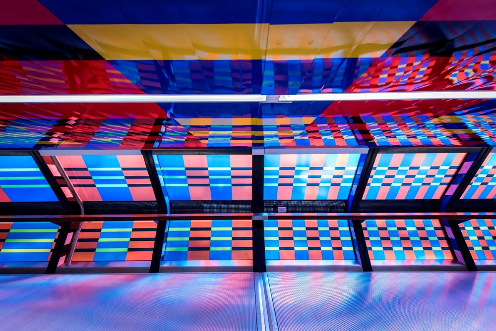 La pieza se inspira en los detalles arquitectónicos de la llamativa estructura, usando el túnel para generan un espacio sorprendente y vibrante para los transeúntes. Jugando con la perspectiva larga del túnel, el diseño colorido muestra un patrón óptico que se contrae y se alarga a medida que se camina, creando un efecto distorsionador. Al cruzar el túnel en cualquier dirección los visitantes se sorprenderán por la potencia del color, que provoca estados de ánimo diferentes.