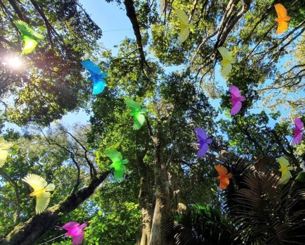 Love Birds es una instalación inmersiva y naturalmente cinética. Deslizándose por encima de la audiencia, los coloridos pájaros revolotean con el viento, atrapando la luz del sol y proyectando fascinantes sombras en el suelo. La bandada de pájaros difunde un mensaje sobre el poder de una comunidad que se une para enfrentar un problema como una sola, ya sea superar una pandemia global o abordar el cambio climático.
