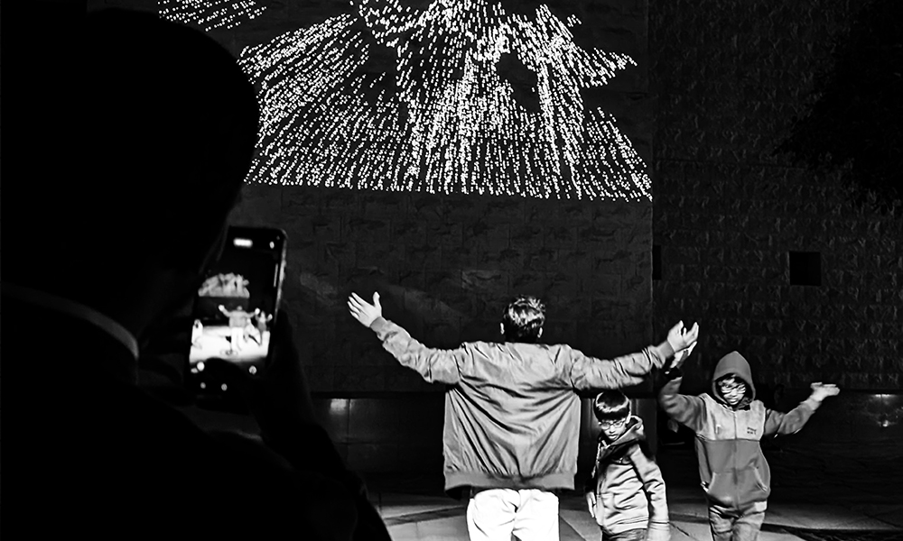Beings of Light cuestiona y transforma la estaticidad del espacio público en un lienzo vivo construido por y para las personas. Una obra intangible, inocua y efímera que solo existe y permanece mientras se forma parte de ella. A medida que los espectadores se alejan, las partículas de luz desaparecen, devolviendo el espacio público a su naturaleza y estado original.