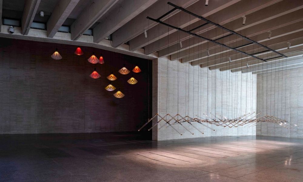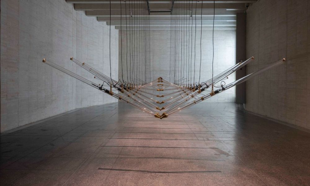 En Amplitud (Amplitude), tubos de vidrio suspendidos en el aire se balancean con un movimiento continuo que recuerda al vaivén de las olas. El espacio se llena de reflejos, oscilaciones y pulsaciones que seducen la mirada y el sentir del espectador. Contemplar ese vaivén no es solo una experiencia estética, es también una forma de reconexión: una pausa que alinea cuerpo y entorno, respiración y materia. La obra nos recuerda que todo en la vida, fluye, oscila, se adapta. Así, esta instalación refleja la idea de que el equilibrio con la naturaleza es también un equilibrio interno. Los elementos actúan de forma independiente, pero su coreografía colectiva crea una unidad visual y emocional que transmite calma y pertenencia.