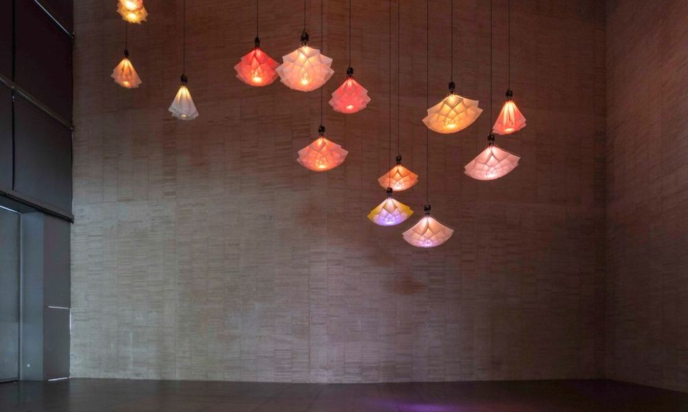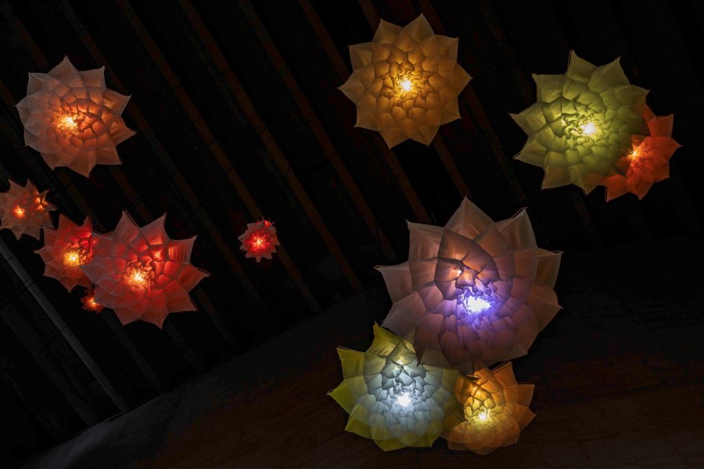 La segunda instalación que recoge la exposición, Pradera (Meadow), propone un paisaje invertido de flores mecánicas que se abren y cierran según la presencia del espectador. Mediante sensores de movimiento, la escultura responde con una coreografía luminosa que evoca el comportamiento de los organismos vivos. Cada flor es única en color y forma, y todas juntas simulan un ecosistema sensible que reacciona con el ritmo de quien lo observa. No hay una narrativa cerrada, sino un diálogo poético que integra el movimiento de los espectadores, generando una atmosfera que invita a la observación de nuestros ritmos y la forma en que estos influyen en nuestro acto de habitar.