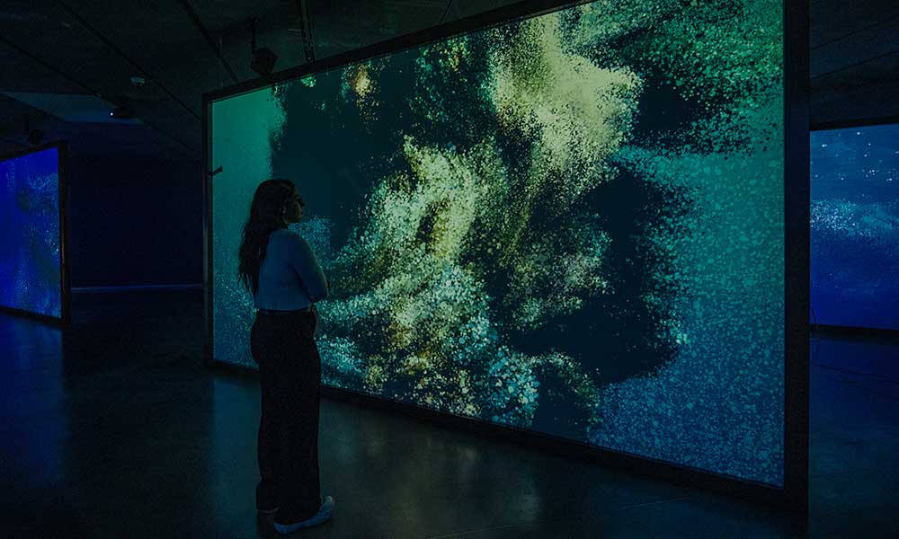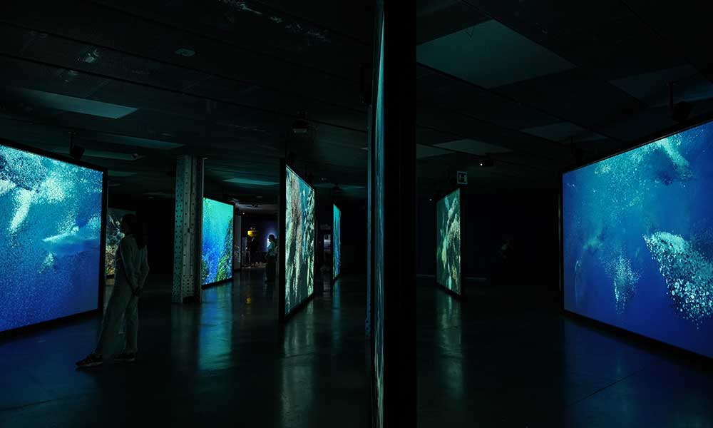 El recorrido comienza con Meditation Room, una instalación sonora que conecta al visitante con los ritmos vitales de ballenas y delfines. Esta antesala da paso a Seeing Echoes in the Mind of the Whale, una obra audiovisual envolvente compuesta por doce pantallas y grabaciones bioacústicas. La instalación muestra el descenso de los cetáceos desde la superficie hasta las profundidades, revelando cómo «ven» mediante la escucha.