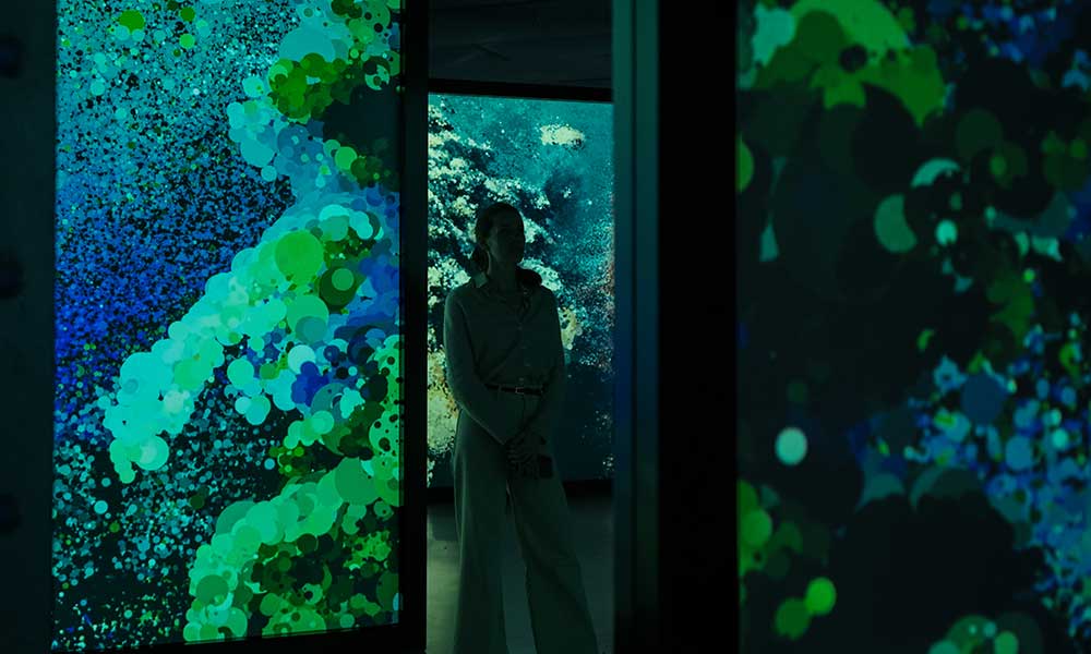 En Templo de plancton, doscientas piezas de vidrio soplado iluminadas flotan en el espacio recreando la migración vertical de los organismos más pequeños del océano. Esta obra escultórica y lumínica pone en valor el papel del plancton como base de la vida marina y generador esencial de oxígeno en la Tierra.