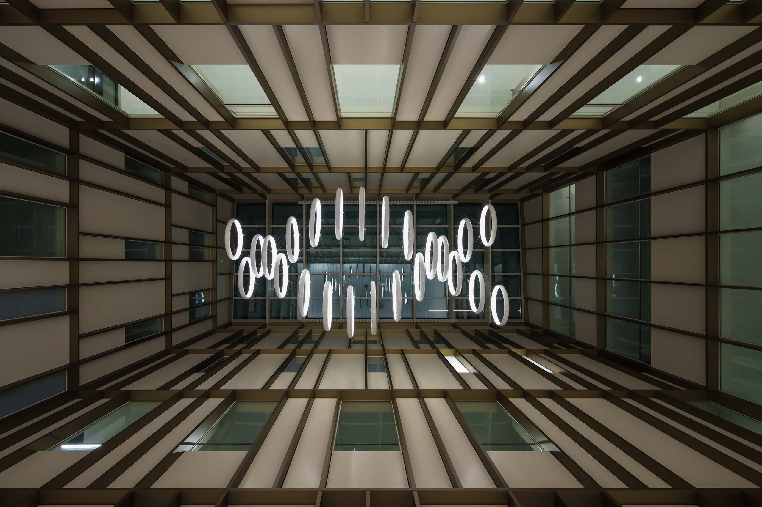 «Loops» se presenta como una obra formalmente directa y sin adornos, pero a medida que se desarrollan sus patrones coreográficos, revela su complejidad intrínseca. Los anillos, en constante movimiento, contrastan con el espacio cuadrangular en el que se encuentran y aportan una sensación de armonía y calma. La obra se despliega desde múltiples perspectivas gracias a las cinco plantas que rodean el atrio, generando una experiencia visual infinitamente cambiante.