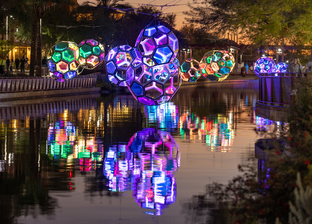 Molecules es una sugerente instalación interactiva de luz y sonido situada en el Canal de Arizona en Scottsdale. Compuesta por cinco moléculas flotantes que simulan agua, esta obra de The Urban Conga fomenta la conexión entre los visitantes y su entorno a través de la interacción lúdica, donde la luz y el sonido juegan un papel fundamental en el proceso. El diseño que se activa mediante el sonido, no solo crea una atmósfera atractiva, sino que también plantea una reflexión sobre el cambio climático y el impacto personal en el entorno natural.