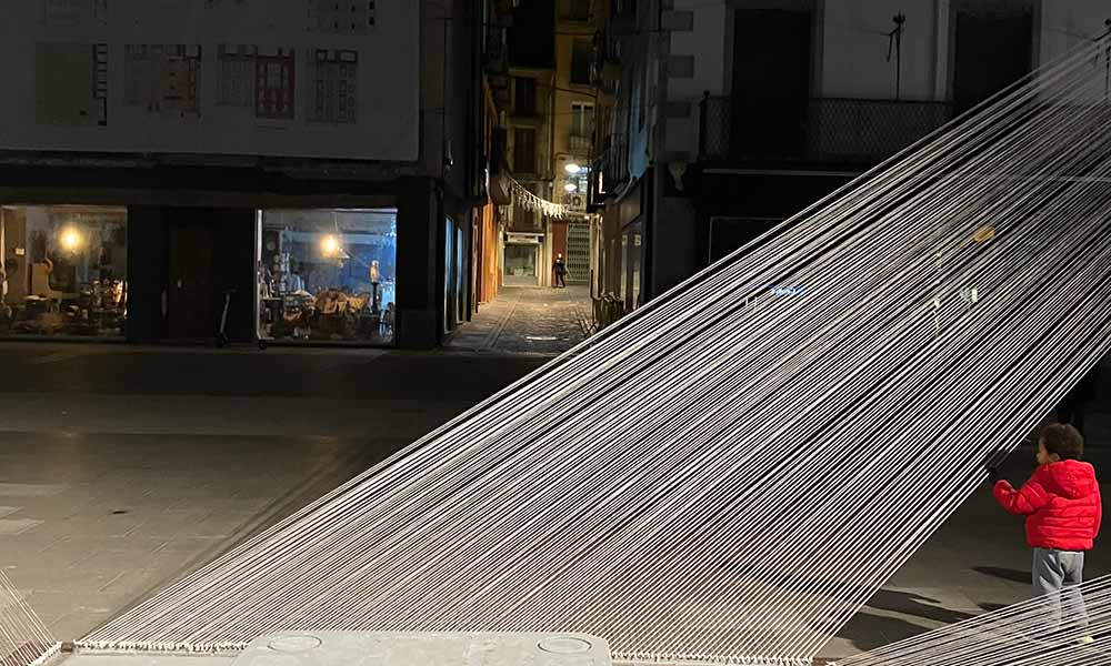 El proyecto reflexiona sobre la condición efímera de los rayos de luz y cómo estos pueden transformar la percepción del espacio que nos rodea. Para ello, se simula la creación de un haz de luz llevándolo a una realidad tangible. La obra parte de una pieza central colocada en el centro de la plaza Mayor, que se enlaza directamente con los cuatro postes eléctricos mediante hilos blancos.