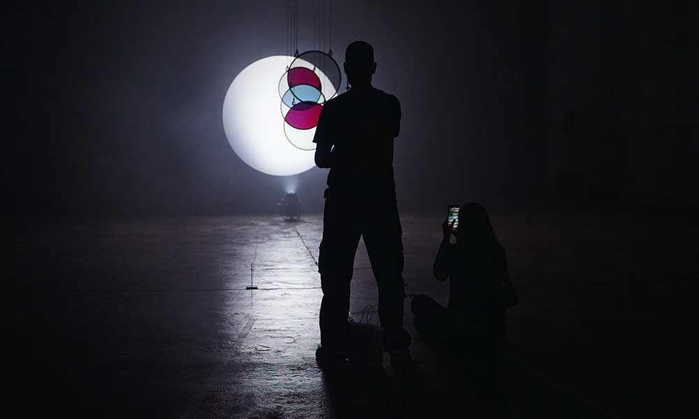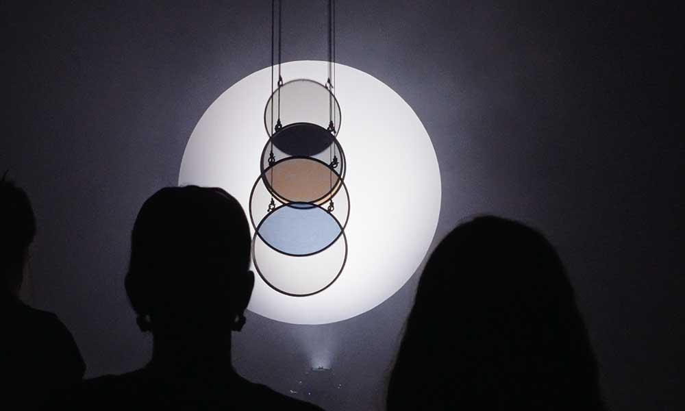 Cada ajuste en el ángulo de los filtros revela imperfecciones controladas que generan un espectáculo de luz y sombra en constante transformación. A medida que estos cambios progresan, la instalación evoluciona desde tonos vibrantes hasta una oscuridad casi completa, simulando la transición de un atardecer hacia la noche. Esta experiencia sensorial permite apreciar el paso de un espectro luminoso complejo a la ausencia de luz, capturando la esencia de la caída del día.