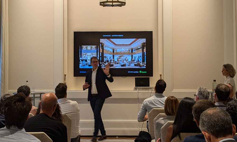 Durante la presentación de Ana Guasp, arquitecto del Estudio Lamela, y Jordi Ballesta, director y socio de Anoche Iluminación, se exploró en detalle el proyecto del Centro Canalejas en Madrid, un desarrollo emblemático que ha transformado siete edificios históricos en un único complejo moderno y multifuncional. El proyecto, que incluye residencias de lujo, el hotel Four Seasons, espacios comerciales y estacionamientos, ha revitalizado el centro urbano madrileño. Ambos ponentes subrayaron la complejidad de la intervención, que respetó la herencia arquitectónica de edificios de distintas épocas combinando restauración con tecnologías contemporáneas.