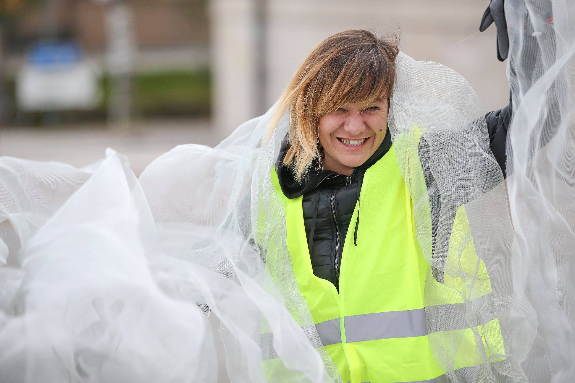 Cuarto día: Rex y David presentan el concepto al cliente. Ivana y Arvid demuestran la maqueta y el efecto de los cristales en el escenario. El concepto se aprueba, y tras recuperar fuerzas en la comida, seguimos con la ejecución. El peso cae mayormente en Marcus y Arvid, nuestros estudiantes electricistas de 18 años, los únicos del grupo que tienen permiso para subir a la grúa para montar la malla. Gabriela e Ivana les dirigen desde abajo, siguiendo las formas de la «Corriente» plasmada en la maqueta.
