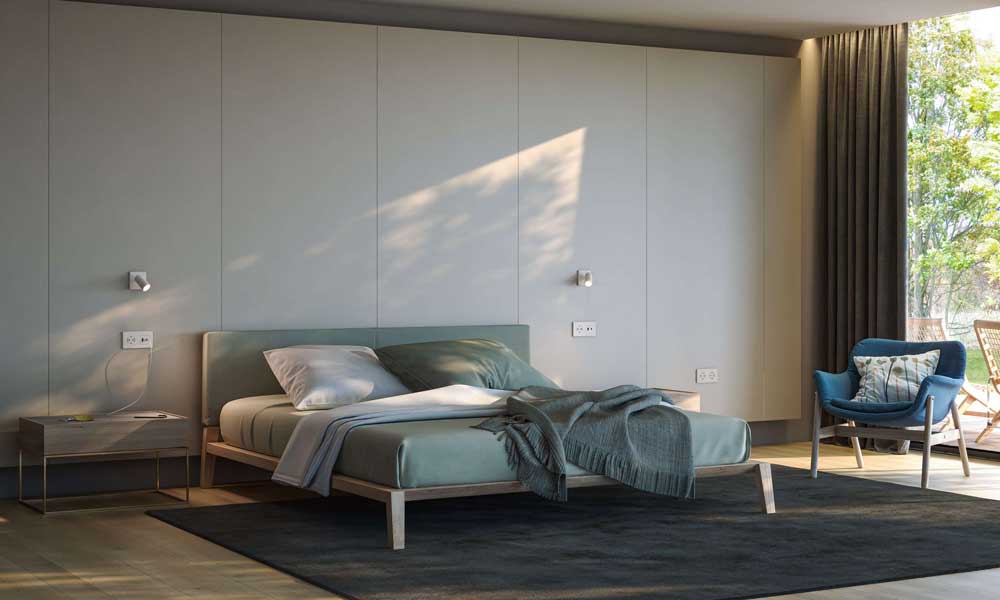 Cada módulo combina acabados estéticos en madera o colores lisos con soluciones de iluminación LED cálida (2700–3000K) integradas enrasadas, sin deslumbramientos y con un rendimiento uniforme. Existen hasta cinco configuraciones de iluminación: lineal, aplique, baliza inferior, además de un módulo especial para cabecero de cama, con enchufe, cargador USB, pulsador y foco orientable.