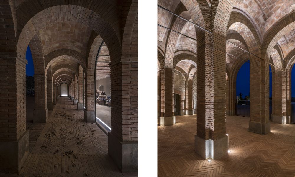 Una iluminación a nivel del suelo ilumina uniformemente la geometría arquitectónica porticada junto a una luz cenital que enfatiza el producto y ofrece funcionalidad a la zona de restaurante.