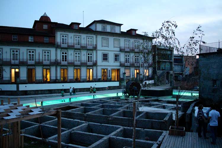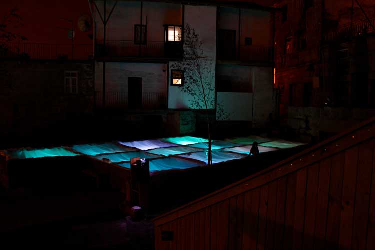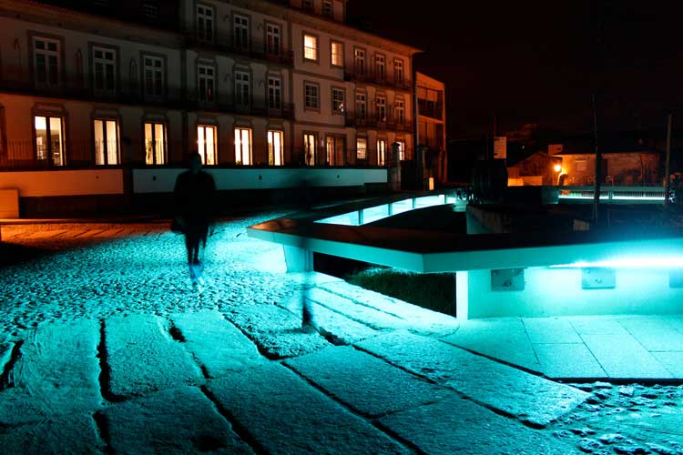 «Con esta instalación intervenimos los antiguos tanques de lavado de pieles de la plaza de Coiros de Guimarães y lo transformamos en un mar. Conseguimos crear un ambiente lírico inspirado en el agua y en crear una marea de luz en la plaza», explica Luisa Álvarez.