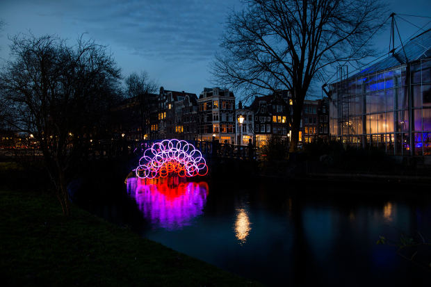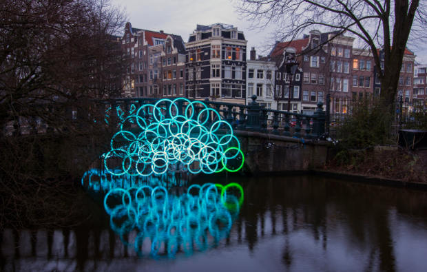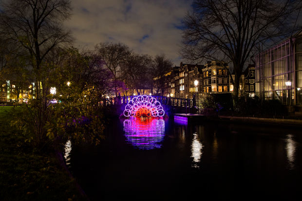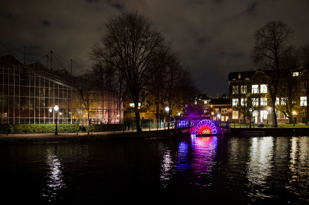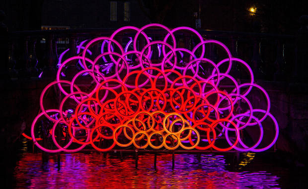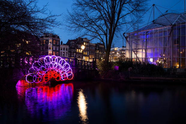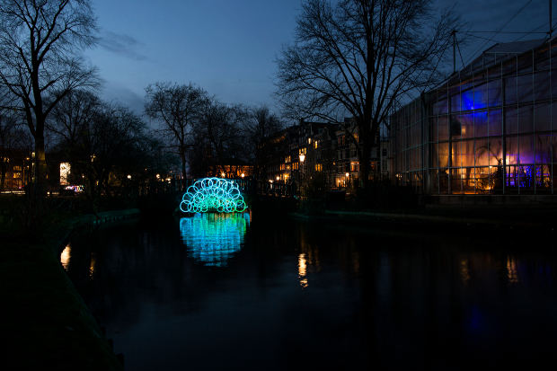 Descripción del proyecto: Instalación lumínica de carácter efímero diseñada para la 4ª edición del Festival de Luz de la ciudad de Ámsterdam, ubicada en ambas fachadas de un puente peatonal junto al Jardín Botánico de la ciudad (Hortus Botanicus). Cada lado consta de más de 50 anillos luminosos conectados entre sí por grupos, lo que permite su control y cambio de colores a modo de escenas.