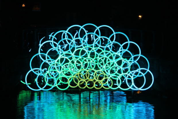 Materialidad: Anillos de policarbonato arenado de diferentes diámetros con Cinta Led RGB conectada a controlador DMX.