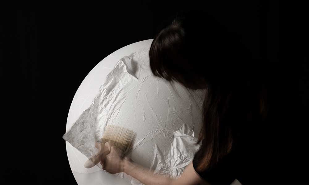 La singularidad de MOON reside en su proceso de fabricación artesanal. Cada luminaria se crea a partir de capas superpuestas de papel japonés aplicadas a mano, generando una textura que evoca la superficie lunar. Este carácter irrepetible convierte cada pieza en una pequeña obra de arte que se adapta a todos los espacios y los transforma con su aura suave y silenciosa.