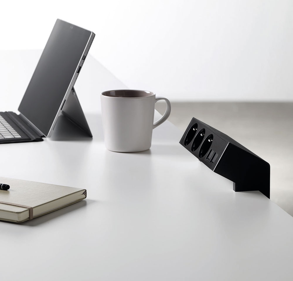 Las soluciones para la instalación dentro de la mesa tienen un único objetivo: liberar el máximo espacio posible en la mesa de trabajo. Debajo de la tapa de metal se ocultan desde bases de enchufe hasta cargadores USB, conectores RJ45 para datos y teléfono o conectores multimedia, que pasan prácticamente desapercibidas.