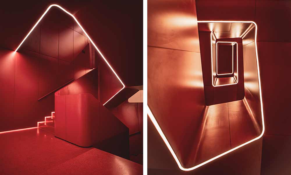 Concebida como una escultura orgánica, la escalera se convierte en un icono y pieza clave del edificio. La luz fluye a lo largo de sus formas sinuosas, creando un juego de contrastes que acentúa su volumetría y potencia su carácter escultórico. Este tratamiento lumínico transforma la escalera en un elemento icónico que invita a ser explorado.