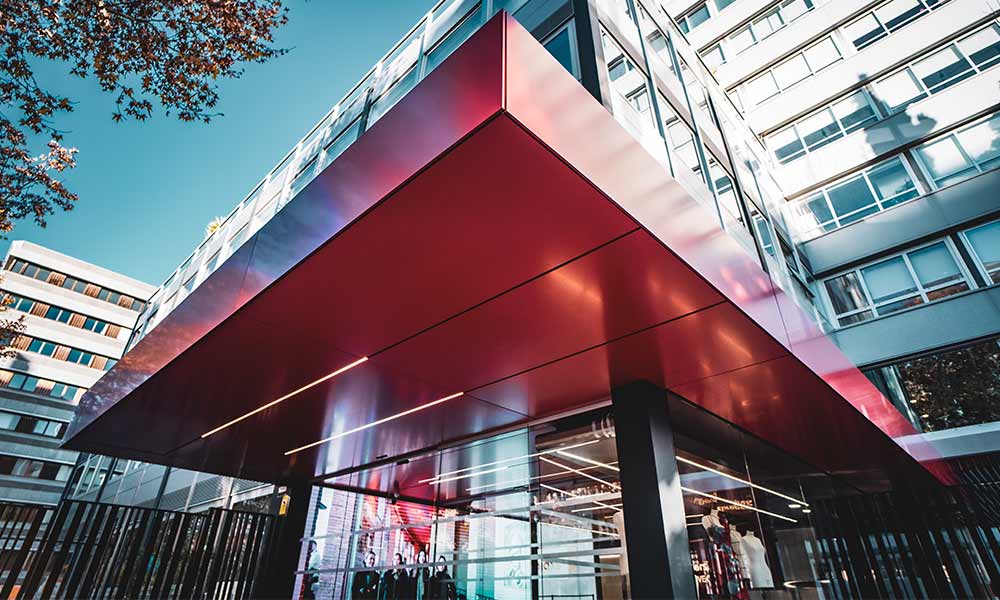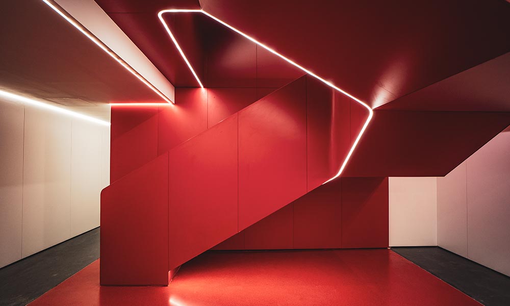 En el exterior, la iluminación se integra en las juntas constructivas de un imponente volumen de acceso, revestido con paneles de aluminio acabados en rojo. La distribución paralela de líneas de luz crea un ritmo visual que invita a descubrir el interior del edificio. Este recurso lumínico aporta dinamismo y refuerza su potente identidad arquitectónica.