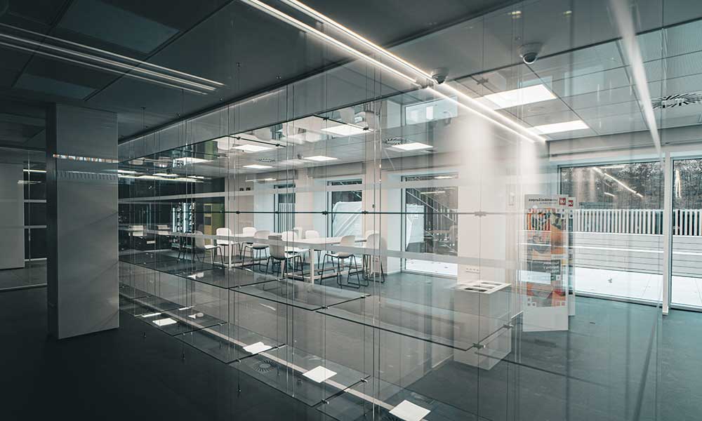 El atrio, punto central del edificio, cuenta con pantallas de vídeo que emiten una luz intensa y de color variable. La iluminación de este amplio espacio de encuentro se concibe para adaptarse a las diversas actividades sin interferir con las pantallas ni provocar reflejos o deslumbramientos.