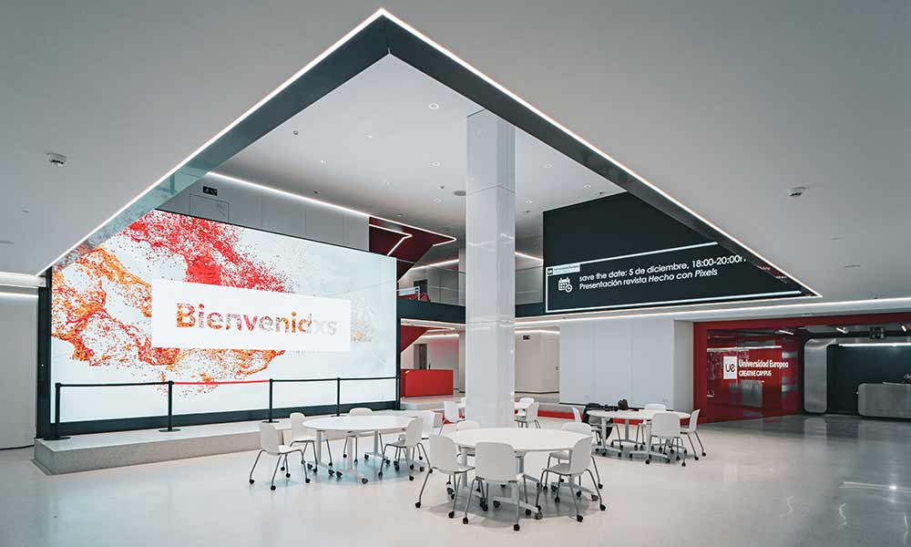 Para ello, se emplean luminarias empotrables y regulables de alto UGR que distribuyen la luz de manera uniforme. Además, se incorporan controles de intensidad según la hora y las distintas actividades. Rafael Gallego, director del proyecto de iluminación, comenta: “la iluminación en el atrio proporciona la flexibilidad necesaria sin restar protagonismo a las pantallas.”