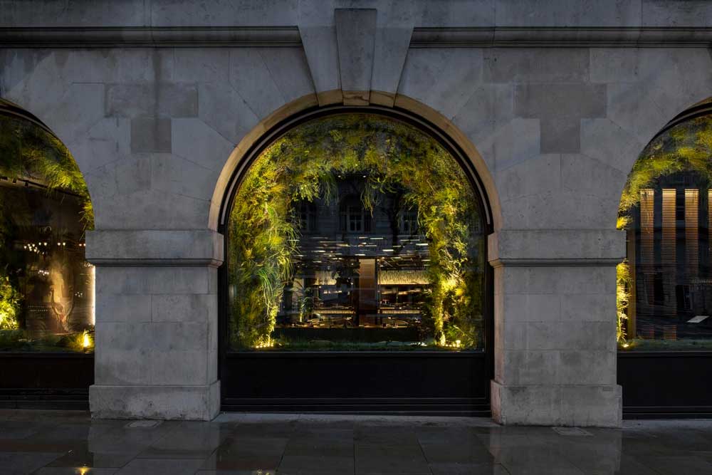 Los frondosos arcos verdes son claramente dominantes en el espacio, ya que hacen aproximadamente 3 metros de alto por 2,50 metros de ancho. Para ello, se han utilizado dos sistemas de iluminación para resaltar todo el arco. Al inicio de cada uno de ellos, se ubica, en la parte inferior, unos wall grazers simétricos de dimensiones muy reducidas y óptica de 10º, junto al mismose ubica otro foco asimétrico de 10º x 45º, que cubre la parte central del arco.