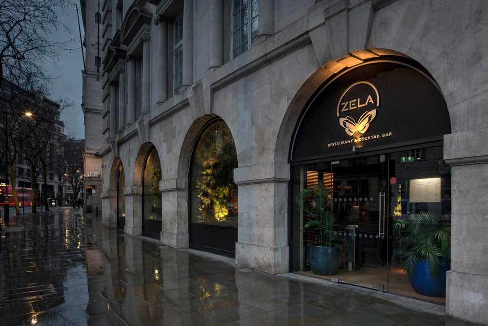 El restaurante Zela se encuentra en un prominente rincón de la planta baja del reformado Hotel Me de Norman Foster, en el West End de Londres, con unas ventanas XXL arqueadas. Se trata de una planta rectangular de 300 m2 con una altura de 2,90 m en el centro y 3,50 m en su perímetro junto a la fachada.