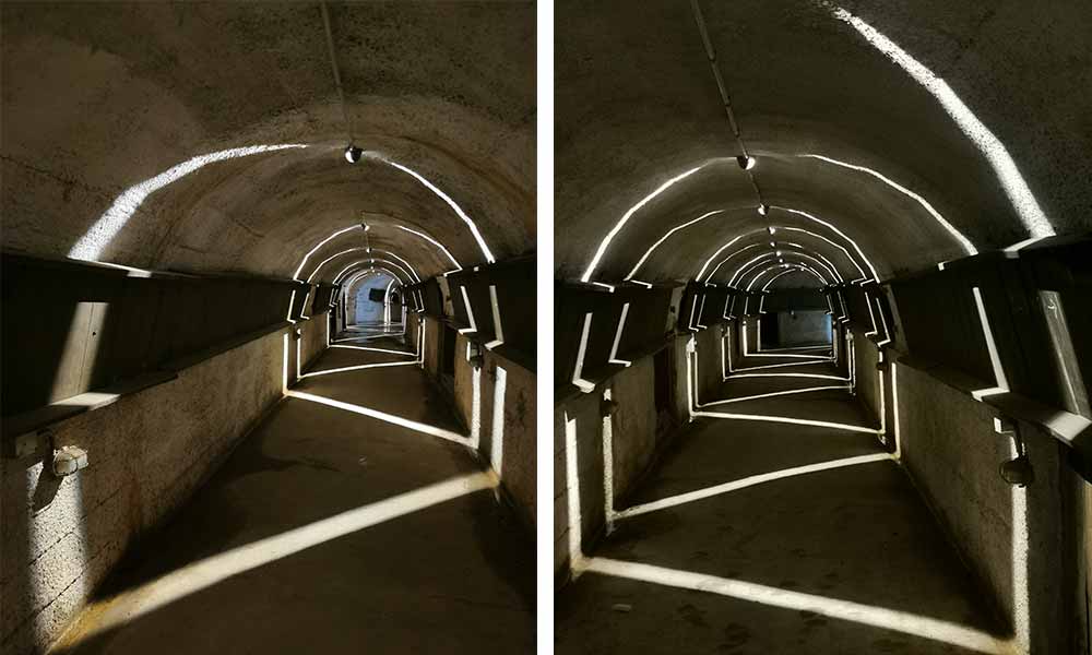 El espacio de techo cóncavo tiene una altura y una anchura de 2×2 metros. Se decidió colocar las luminarias en la parte superior con diferentes ángulos de orientación entre ellas para crear una iluminación continua. Cada haz de luz resalta las marcas en las paredes y el suelo, recordando a los visitantes la función defensiva de estos búnkeres.