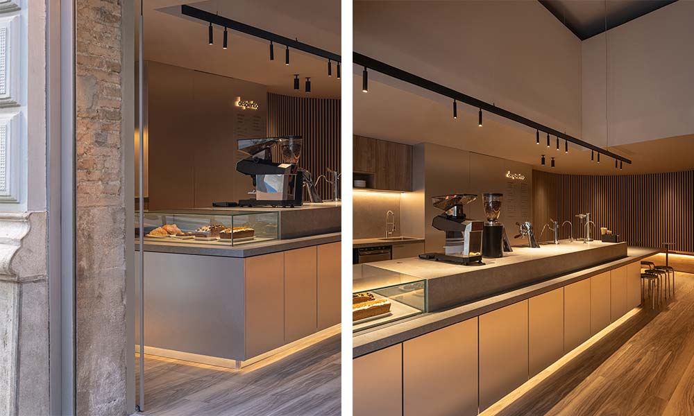 La luz integrada adquiere un papel determinante en la construcción de la atmósfera. La perfilería con tira LED de Beghelli oculta en bancos, estanterías y encuentros arquitectónicos, genera una iluminación indirecta continua que enfatiza la geometría del proyecto y realza la textura de la madera.