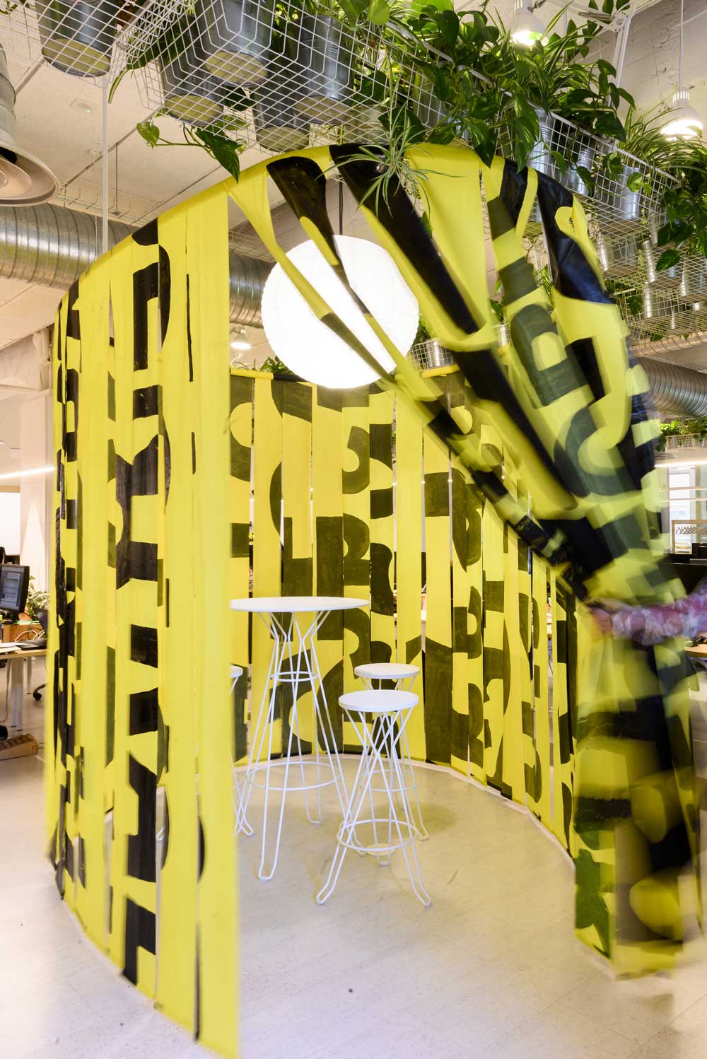 En el primer eje de actuación se genera la base conceptual del proyecto de iluminación: un espacio desenfadado, flexible, ecléctico, ecológico y comprometido con el medioambiente. Si pensamos en Greenpeace, podemos decir que representan idealismo, acción y denuncia. Las personas que trabajan para esta organización no lo harían en cualquier otra empresa. El ADN de Greenpeace está en sus propios valores, es una parte íntima y profunda de cada uno de ellos, y conlleva un sentimiento de pertenencia. Esta manera de entenderla ha sido determinante en la visualización de la luz del espacio, que lejos del estándar de una iluminación de oficinas, debía de ser cálida, acogedora y personal. A excepción de las luminarias técnicas, destinadas a la zona de trabajo y despachos, en las que ha primado la funcionalidad, calidad de la luz y confort visual, el resto de luminarias que configuran el espacio han sido diseñadas expresamente en base a dos premisas: reforzar su identidad y entrar en presupuesto.