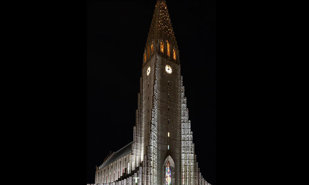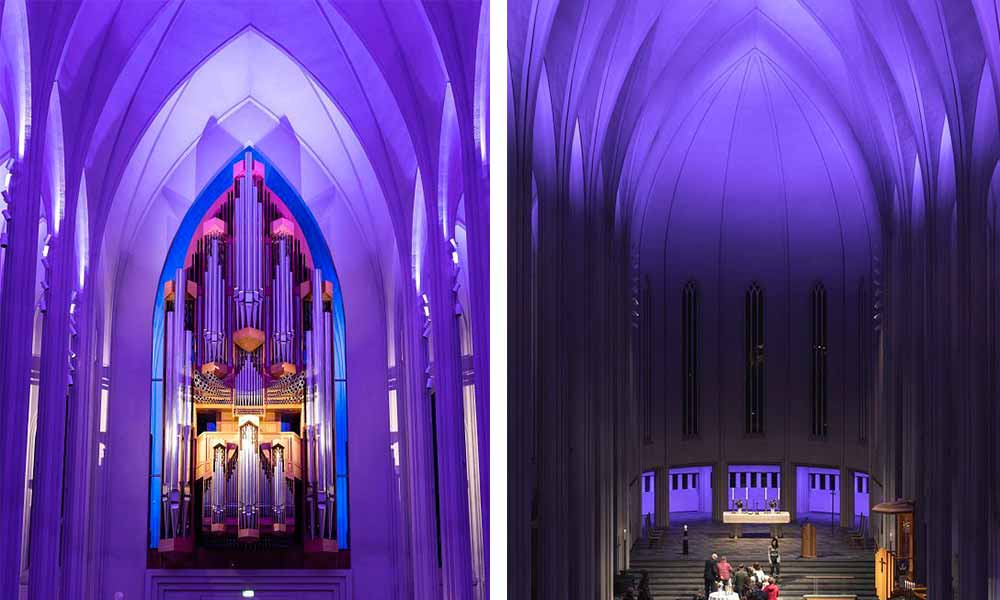 Sugiriendo la forma de un géiser, la Iglesia Hallgrímskirkja presenta una impresionante arquitectura con curvas y líneas que se extienden hacia las bóvedas. El proyecto de iluminación resalta las características arquitectónicas, otorgando una mayor profundidad y volumen espacial. La iluminación RGBW y de tono blanco ajustable –tunable white- se utiliza para destacar los elementos arquitectónicos más importantes. De esta manera, la luz influye de manera positiva en la percepción de los visitantes y su relación con a la arquitectura.
