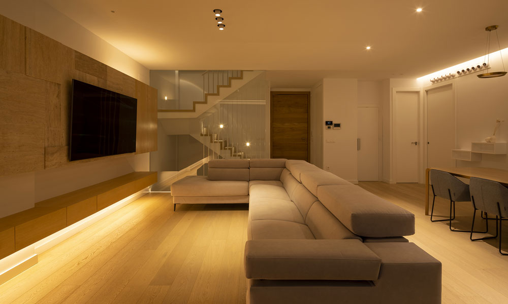 Pero si algo distingue a esta vivienda es la conexión con el exterior y los escenarios creados a través de la luz, evitando los elementos decorativos. Para ampliar la percepción espacial y dar respuesta al cliente que «queria que el espacio respirara pero transmitiera calidez», las interioristas contaron con la colaboración del estudio de diseño de iluminación BIG Architectural Lighting.
