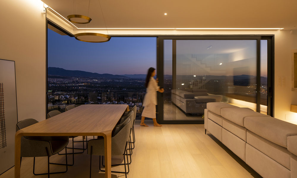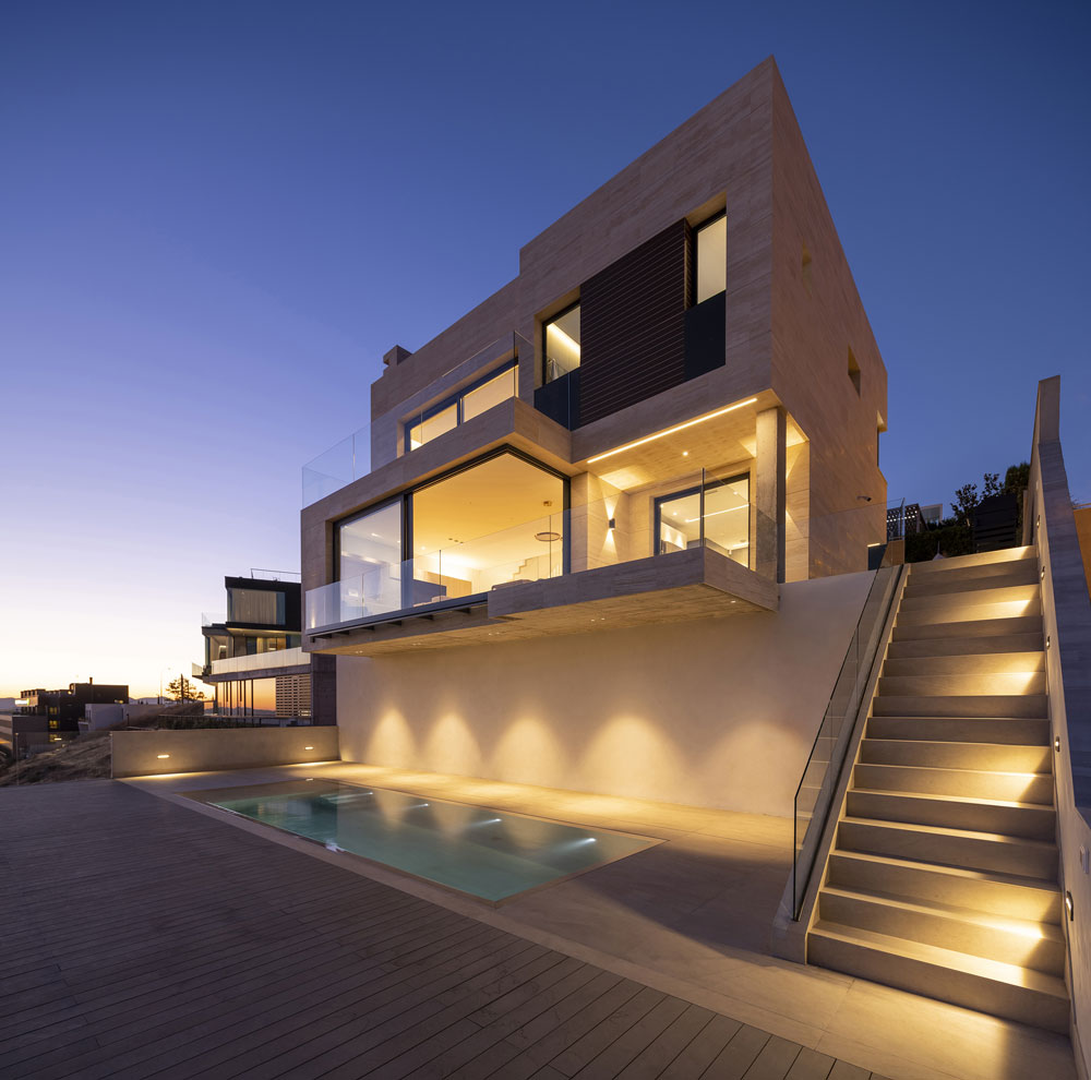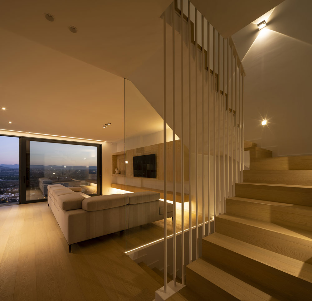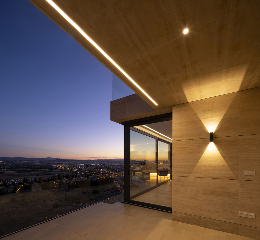 Las distintas terrazas, así como la escalera exterior hacia la planta de la piscina, se han iluminado con productos de la firma Performance in Lighting, logrando una iluminación suave y sutil que pone en valor la estructura arquitectónica y consigue una conexión perfecta entre interior y exterior.