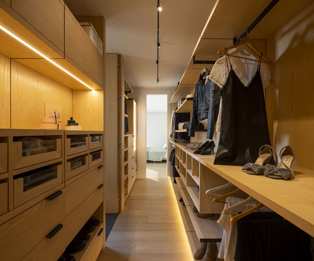 «El vestidor del dormitorio principal es otro ejemplo del espectacular trabajo de carpinteria llevado a cabo en toda la vivienda». Para iluminarlo, BIG Architectural Lighting prescribió el sistema de iluminación de perfilería magnética SPLITLINE que aloja los proyectores multidirigibles SPY, para proporcionar luz de acento, así como lineales con perfil RENDEZ VOUS, todos de la firma Delta Light.