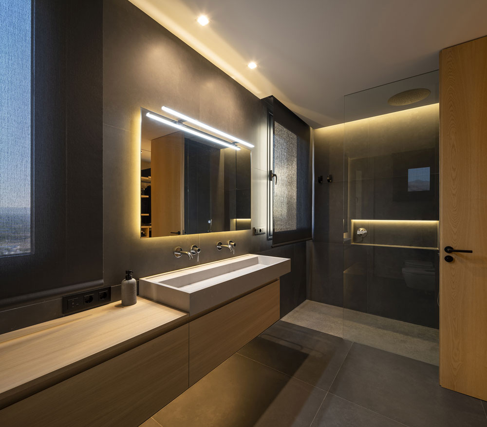 En los baños destaca la integración de los perfiles RENDEZ VOUS, que aportan una luz suave y difusa, y las luminarias DEEP VARO instaladas sobre el mueble.