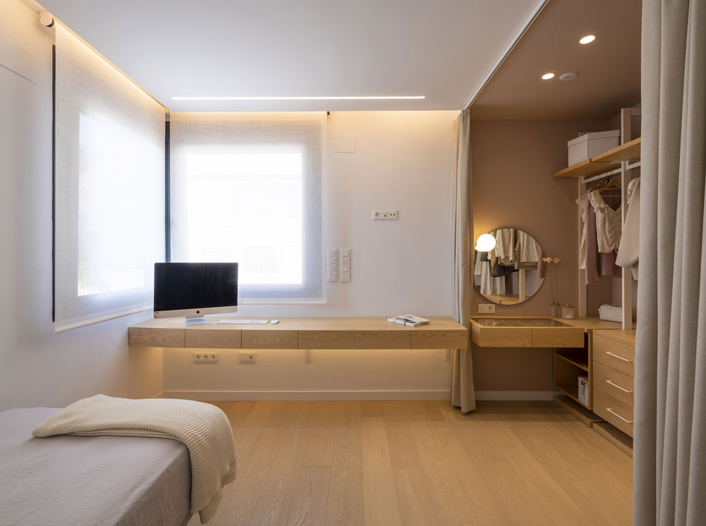 En el dormitorio de una de las hijas adolescentes del matrimonio una cortina separa y cierra el vestidor con tocador, continuación del escritorio diseñado y realizado a medidad de forma artesanal. La iluminación se ha logrado mediante luminaria empotrada STREAMLINER sobre el escritorio y DEEP VARO en el vestidor.