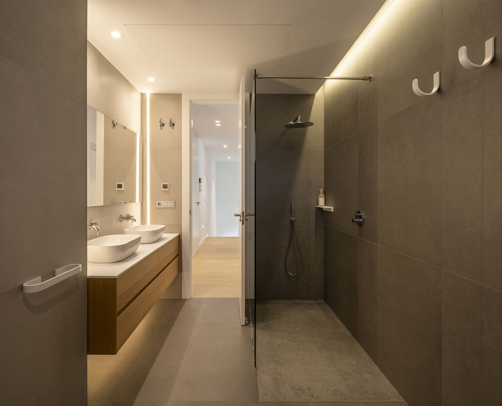 Para conseguir una atmósfera cálida y de suave intensidad, en el baño se han incorporado unos sutiles foseados de luz indirecta en la ducha y en la repisa.