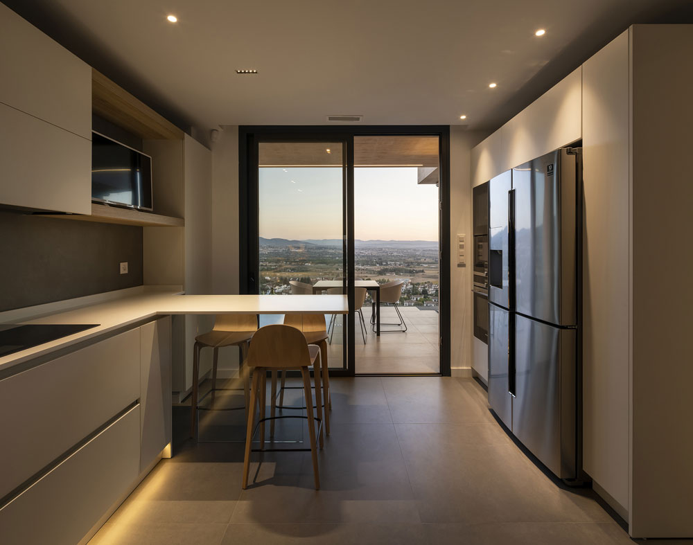 La estructura volada de la vivienda situada en El Serrallo, una de las zonas más demandadas de Granada, así como su fachada de travertino condicionó desde el primer momento la intervención. De esta forma, potenciando las cualidades del emplazamiento y respondiendo a las necesidades del cliente, se apropiearon de la nobleza del material exterior y lo trasladaron al interior para crear una mayor unidad.