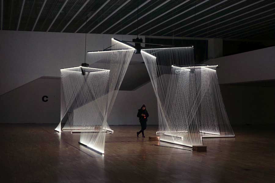 La pieza reflexiona sobre la luz, como materia intangible, que desvela su presencia y sus características solo interactuando con los materiales y bajo algunas condiciones específicas. Los prismas de los seis lucernarios inspiran el diseño de seis estructuras de sutiles hilos translucidos que juegan a descomponer su misma geometría generando nuevas composiciones dinámicas y envolventes. Las seis estructuras, emplazadas finalmente en la Sala A del Museo del Diseño, se van materializando y desmaterializando según la progresión del punto de vista del observador y según la presencia o la ausencia de la luz artificial. Las finas líneas van trazando los límites de unos planos imaginarios, que crean múltiples capas superpuestas entre sí, generando efectos ópticos de dinamismo visual. Por otro lado, la iluminación, oculta en las estructuras de soporte de los telares, genera una capa de lectura del espacio añadida, otorgando materialidad, color y dinamismo a unos elementos por lo demás translucidos, etéreos y casi invisibles. El visitante tiene la opción de observar el conjunto desde lejos, para apreciar la interrelación de las formas y de los dinamismos de luz, o de meterse dentro de cada una de las estructuras, para una experiencia más personal e inmersiva.