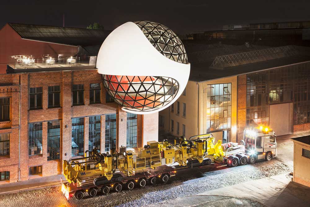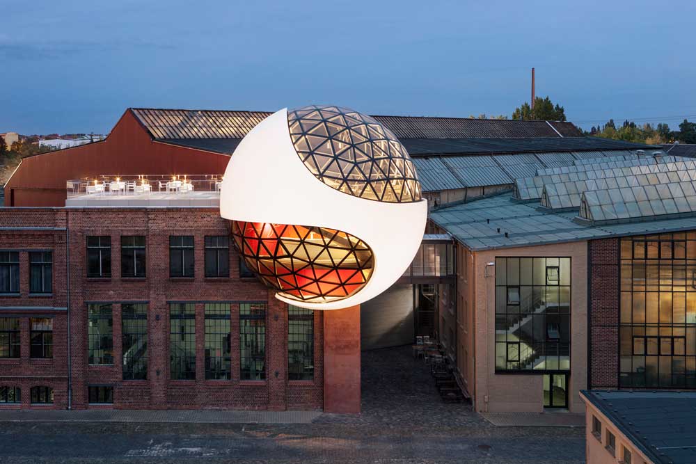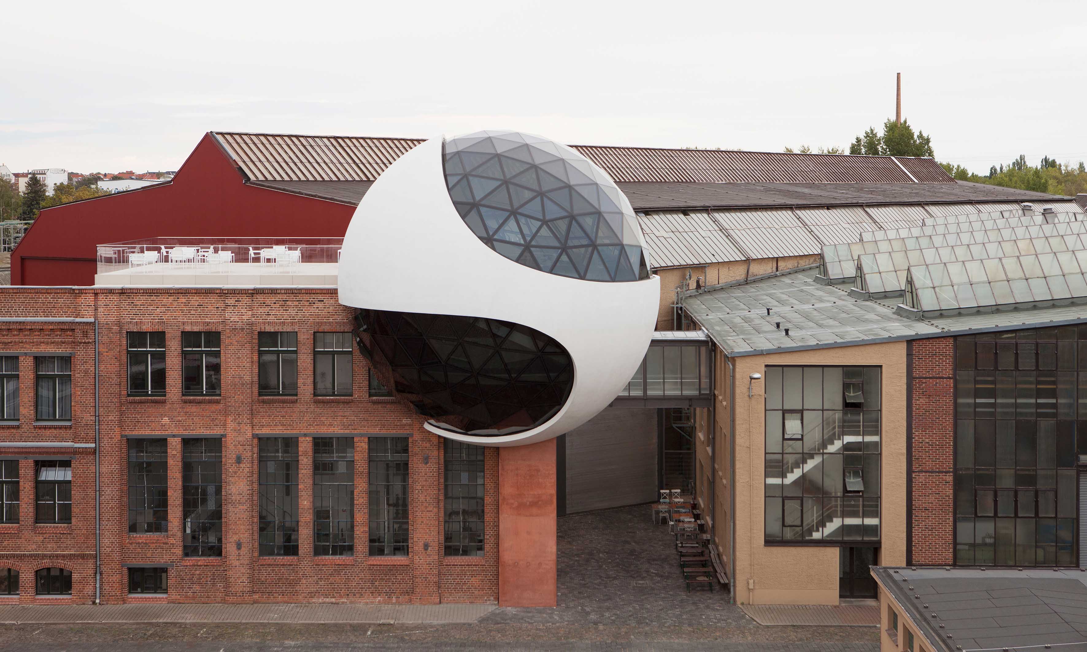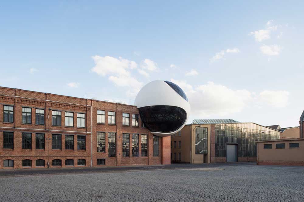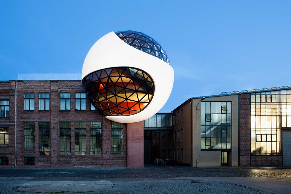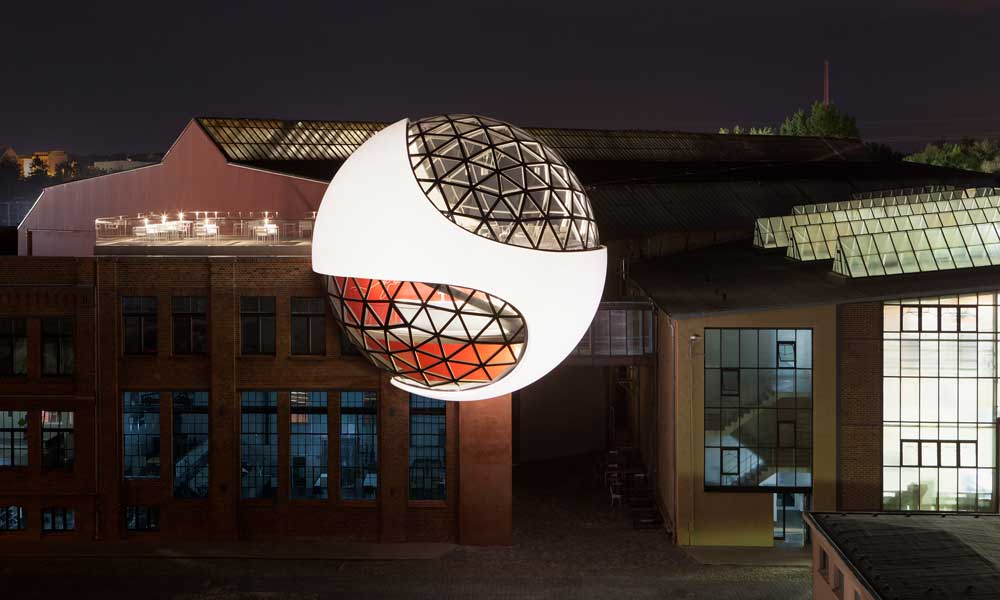 Cuando alguien que entrega tranvías a muchas ciudades alemanas con su empresa HeiterBlick y es líder mundial en el mercado de las grúas ferroviarias producidas por Kirow, visita a uno de los grandes arquitectos con la solicitud de ampliar el comedor de su empresa para mantener a su ambicioso chef, uno debe esperar algo extraordinario. Y así, la Esfera Oscar Niemeyer, que lleva el nombre de su autor, parece haber caído del cielo y haber aterrizado en la esquina del edificio de la cantina catalogada en las instalaciones de la Techne Sphere Leipzig en Niemeyerstrasse. La esfera blanco-negra parece trascendente con la perfección de su forma y superficies; su estructura improbable y su naturaleza inflexiblemente audaz no necesitan explicarse.