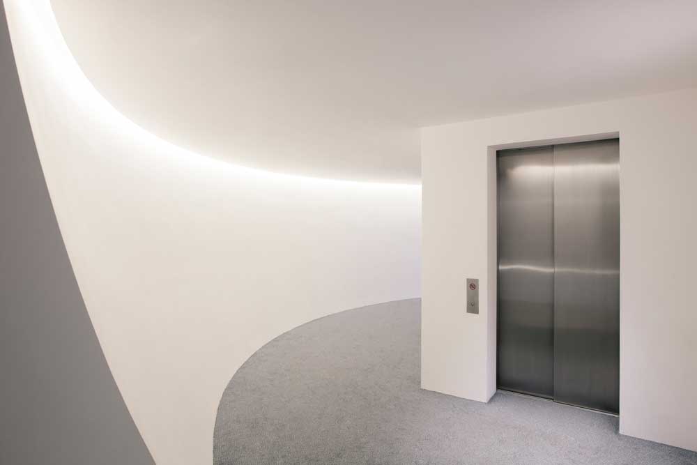 Se accede a la Esfera a través del eje de hormigón en la cabecera del edificio, que alberga un vestíbulo de ascensor y el ascensor central a los pisos superiores. La superficie de hormigón de color ladrillo también se extiende hacia el interior del hueco y está suavemente iluminada por una luz de techo que se ha integrado en un panel de techo inclinado hacia la puerta del ascensor. Tanto el techo como la luz tienen una función orientadora.