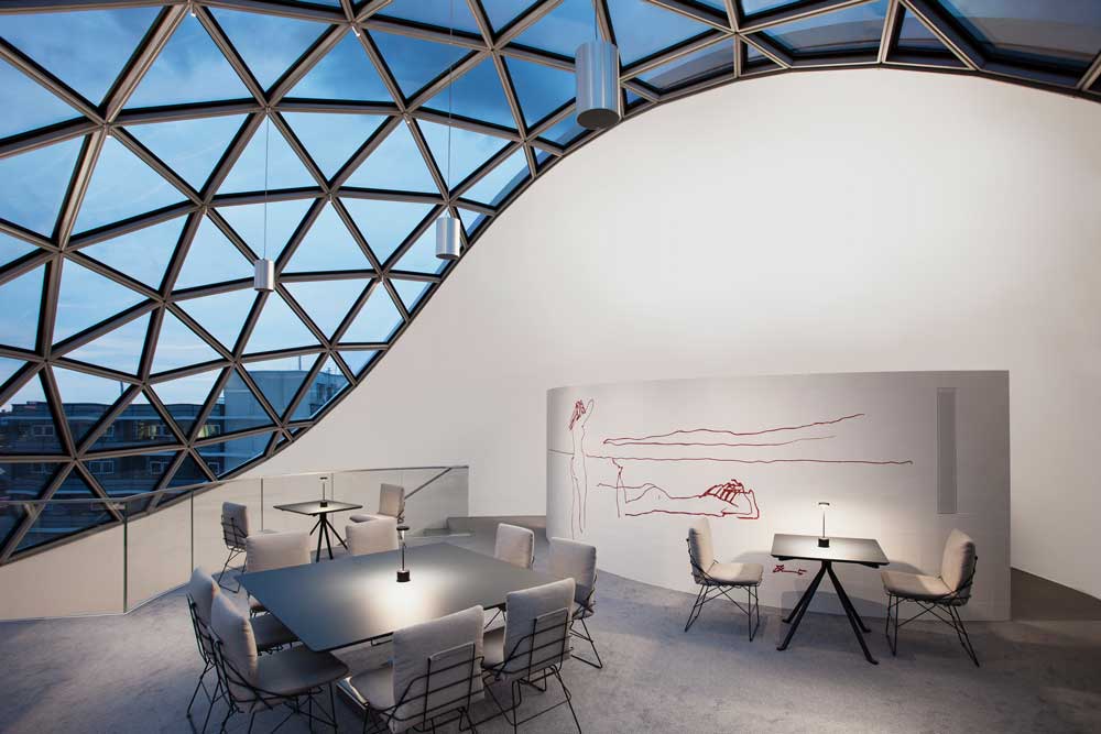 Dos recortes de forma orgánica abren la perfecta carcasa de hormigón, se cierran con una tracería de acero geodésico, cuyos 147 paneles triangulares de cristal líquido se pueden colorear de negro para sombrear en función de la luz solar directa. La ilusión de una locura arquitectónica permanece intacta, ya que ninguna escalera o puerta perfora visiblemente la carcasa.