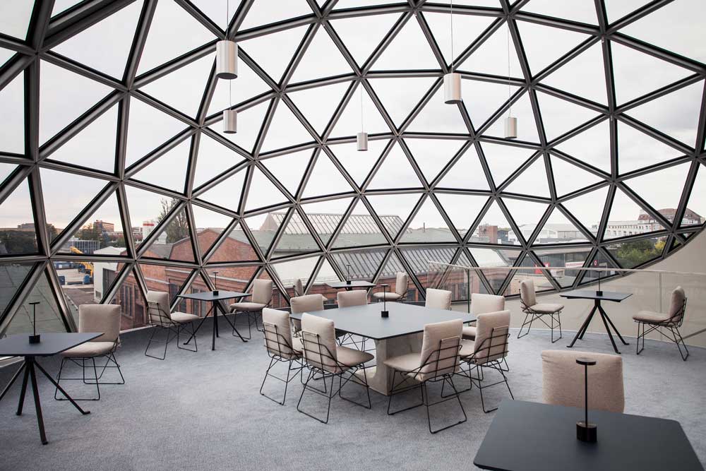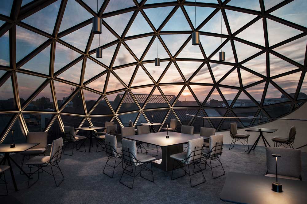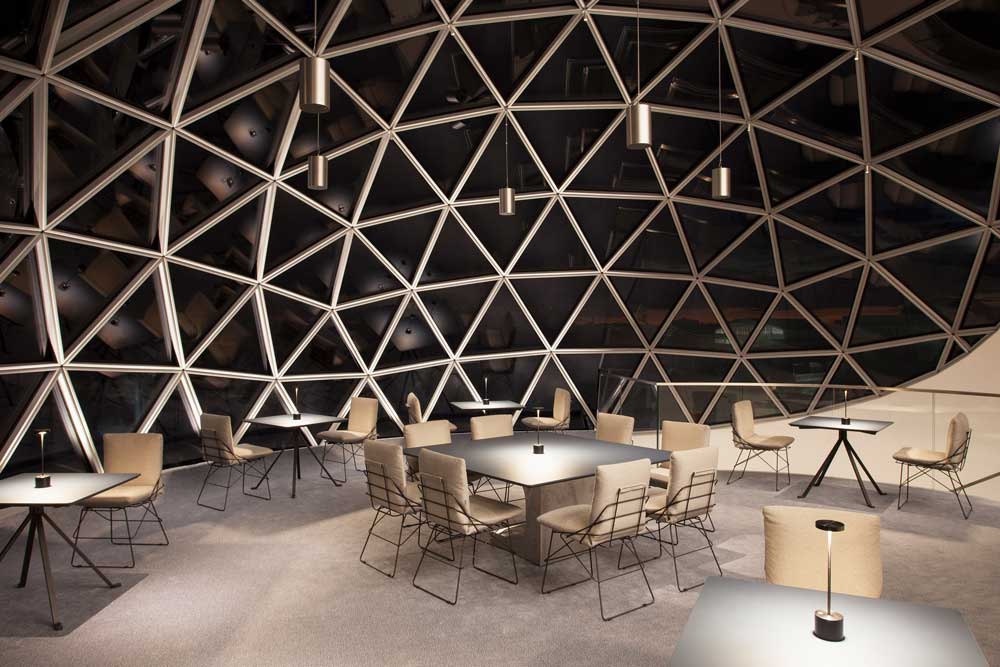 El restaurante y el salón se encuentran a la altura del ecuador de la esfera, a la que se accede desde el bar a través de una escalera interior flotante. Mientras que el área de servicio del restaurante en la parte posterior de la esfera está rodeada por una pared ajustada, los visitantes diurnos están sentados en el área anterior del restaurante, inundada de luz, debajo de una bóveda de vidrio que ofrece maravillosas vistas del exterior.