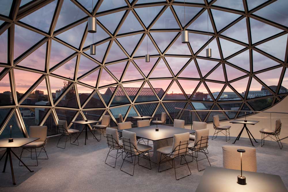 Otra capa de luz se agrega a través de focos en miniatura en las uniones de la construcción de acero, que se utilizan para la iluminación directa en el comedor y las escaleras, así como para enfatizar el mural expansivo. Todas las luminarias son ajustables en ángulo de haz y ángulo de inclinación. Para poder disfrutar de una vista tranquila del cielo de Leipzig, incluso durante las horas de la noche, era importante para los diseñadores de iluminación que las superficies del piso y la mesa se mantuvieran en un tono oscuro para evitar reflejos en los cristales. En los comedores, las luminarais de sobremesa que funcionan con baterias proporcionan una iluminación íntima y local en las superficies de las mesas, mientras que las luminarias del techo proporcionan una luz atmosférica gracias a su regulabilidad. Para otros eventos, como conferencias o recepciones, las luminarias de techo se utilizan para proporcionar iluminación general.