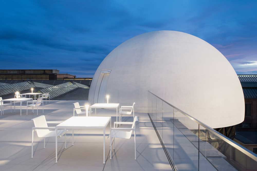 Pequeños focos orientables están integrados en la parte superior del tabique e iluminan la carcasa interior de hormigón, que actúa como un reflector blanco. Pequeños focos adicionales se encuentran en el conducto de ventilación del piso negro a lo largo del perímetro de la esfera, directamente al lado de la construcción de vidrio-acero, para lavarlos suavemente con luz indirecta.