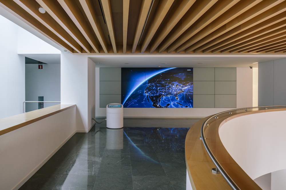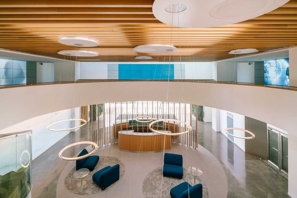 El estudio Lacomba Setoain Arquitectos Asociados han sido los autores de la reforma del Hall y el espacio Expoindra en la sede corporativa de Indra en Alcobendas, Madrid. El edificio de Indra ha logrado la certificación ‘LEED Oro‘. un sistema de evaluación internacional desarrollado por el U.S. Green Building Council para fomentar el desarrollo de edificaciones sustentables y eficientes energéticamente.