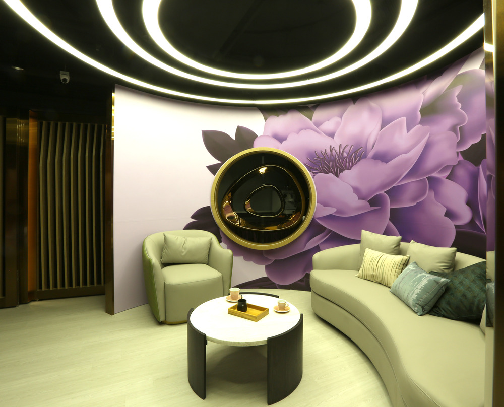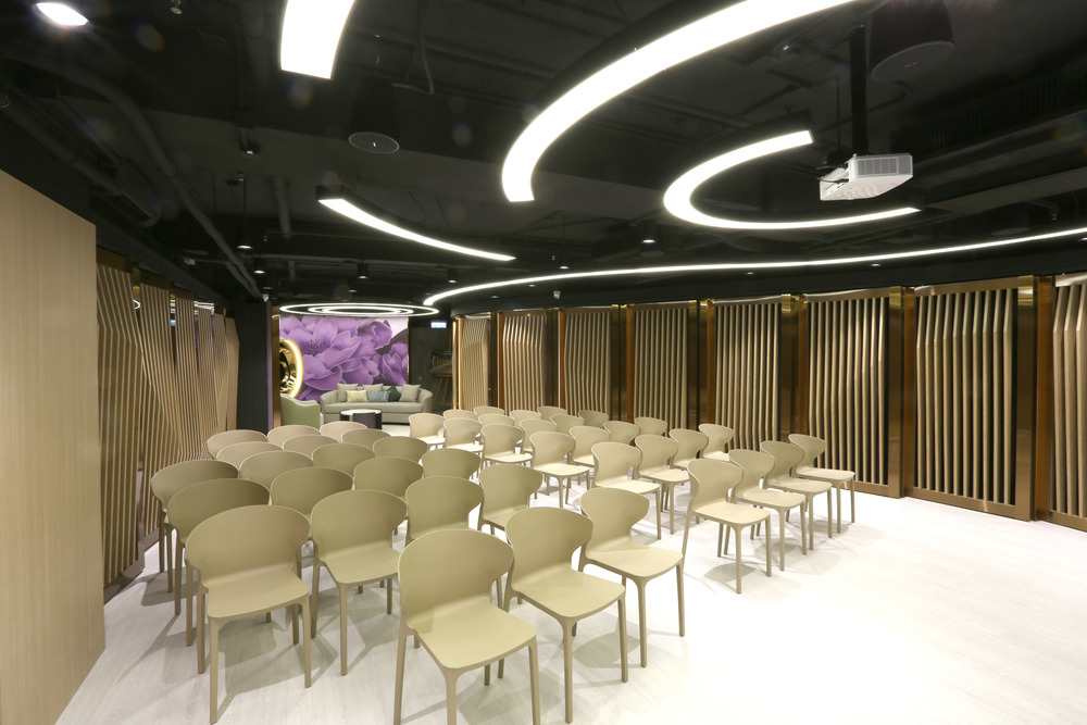 Mientras que el espacio funcional donde tienen lugar los eventos está rodeado por los paneles curvos segmentados, el espacio adicional fuera de la curva no se desperdicia y sirve para funciones internas. El espacio concluye en el área de descanso, que presenta una pared perfectamente curva con un supergráfico de la flor de peonía favorita de la cliente, atravesada por un logotipo suspendido en el aire.