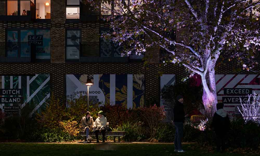 El diseño de Elephant Park -un corazón verde en el centro de la zona Elephant & Castle de la ciudad Londres – está inspirado en la necesidad de provocar un acercamiento de la comunidad local con la naturaleza. La prestigiosa oficina internacional Speirs Major ha logrado crear experiencia lumínica que apoya y refuerza la función de espacio y centro social.