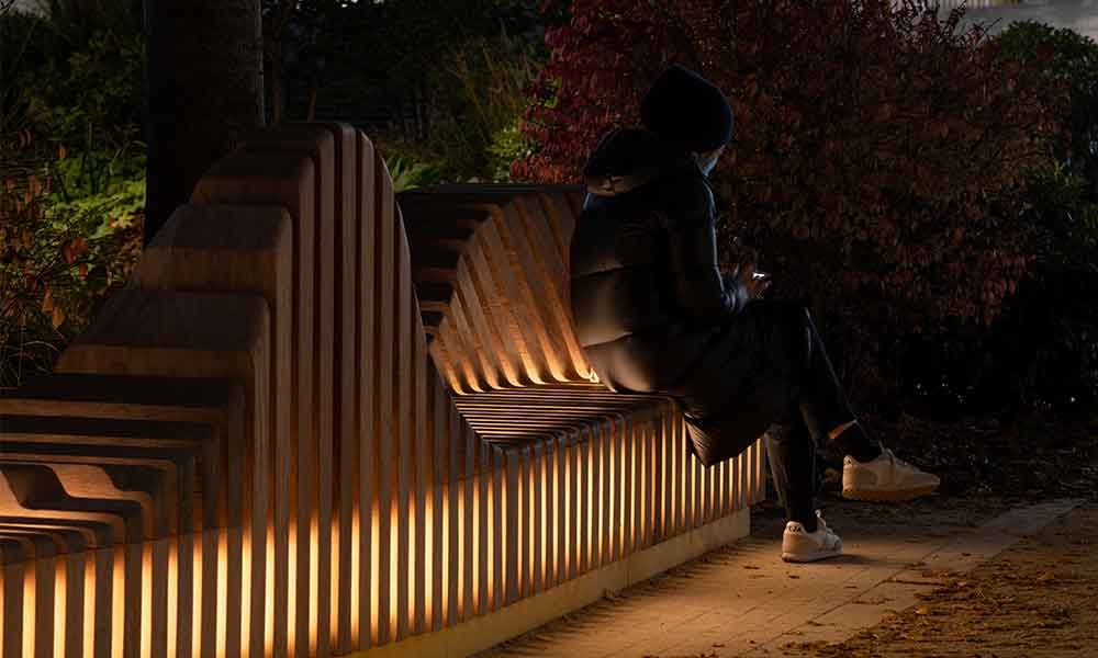 La iluminación se integra de forma sutil en el mobiliario urbano, destacando especialmente los bancos que se acentúan con el apoyo de luces de lectura individuales. Una acción que crea rincones cómodos e íntimos para reunirse y charlar de forma distendida.